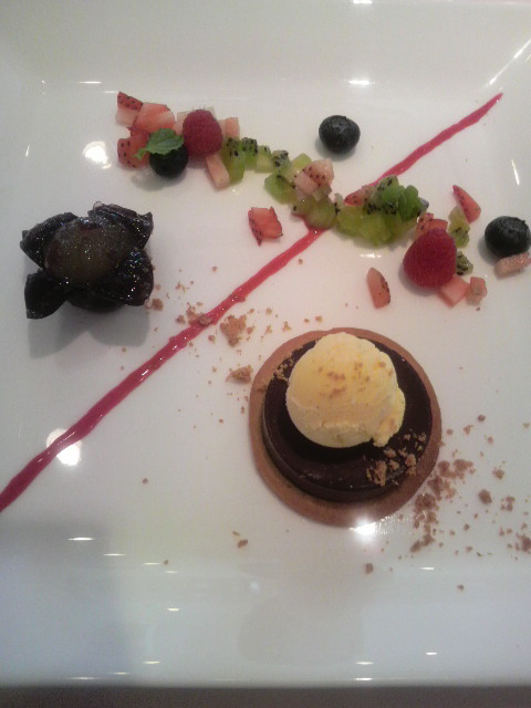 もうひと品は、 チョコレートと塩アイス 巨峰と彩りフルーツ添え